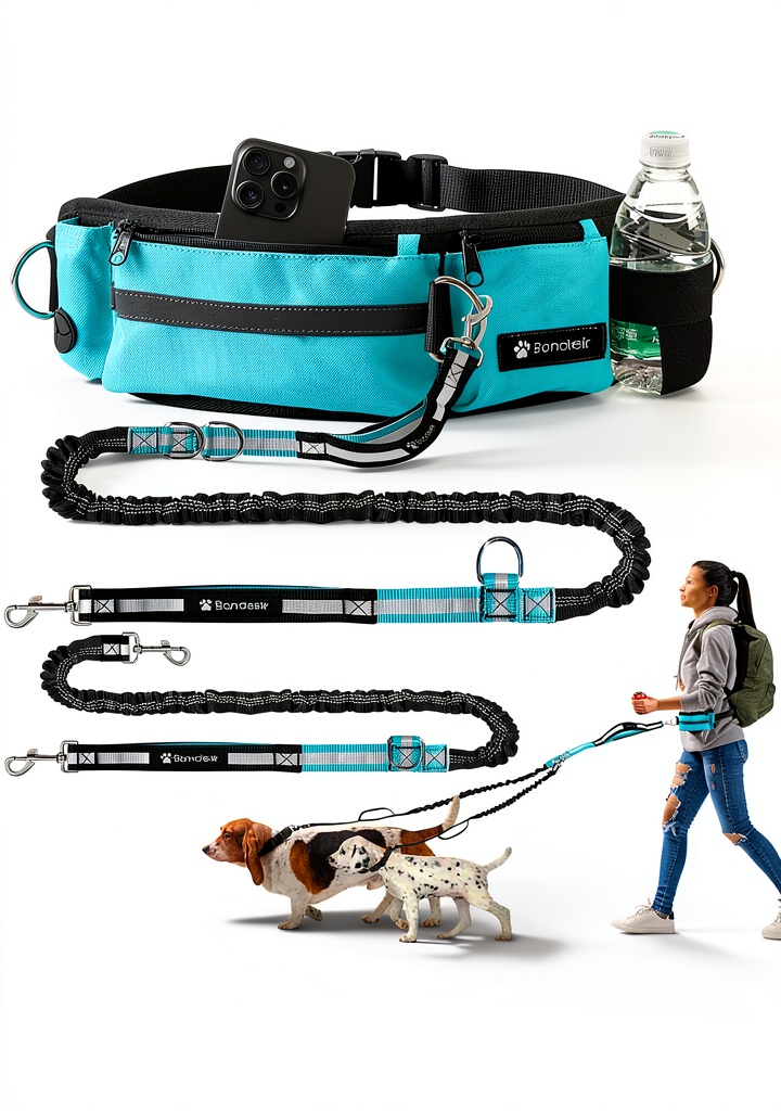 - Smart double leash design for walking two dogs hands-free with a secure waist belt