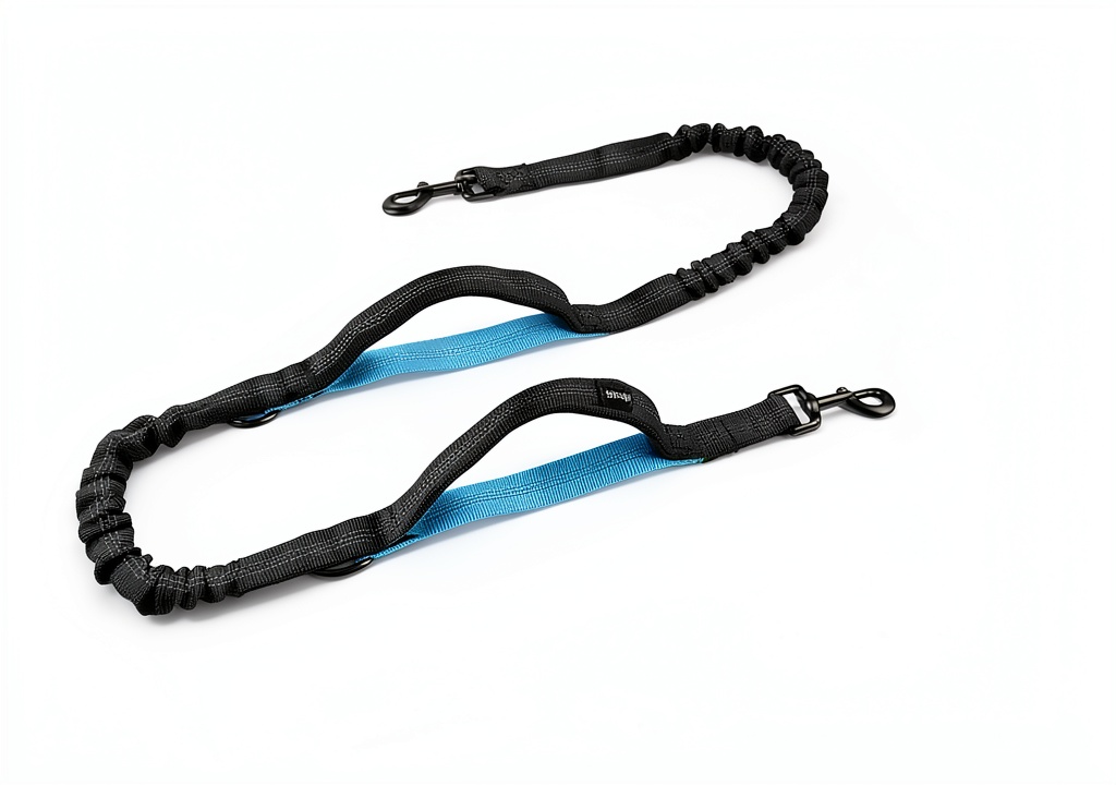The leash is designed to support dogs up to 150 lbs, with the dual bungee system effectively absorbing shock to prevent strain.